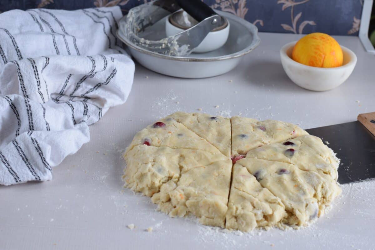 - Turn the dough out onto a lightly floured surface and press into a 1-inch thick circle. Cut into 8 wedges and place on the prepared baking sheet.